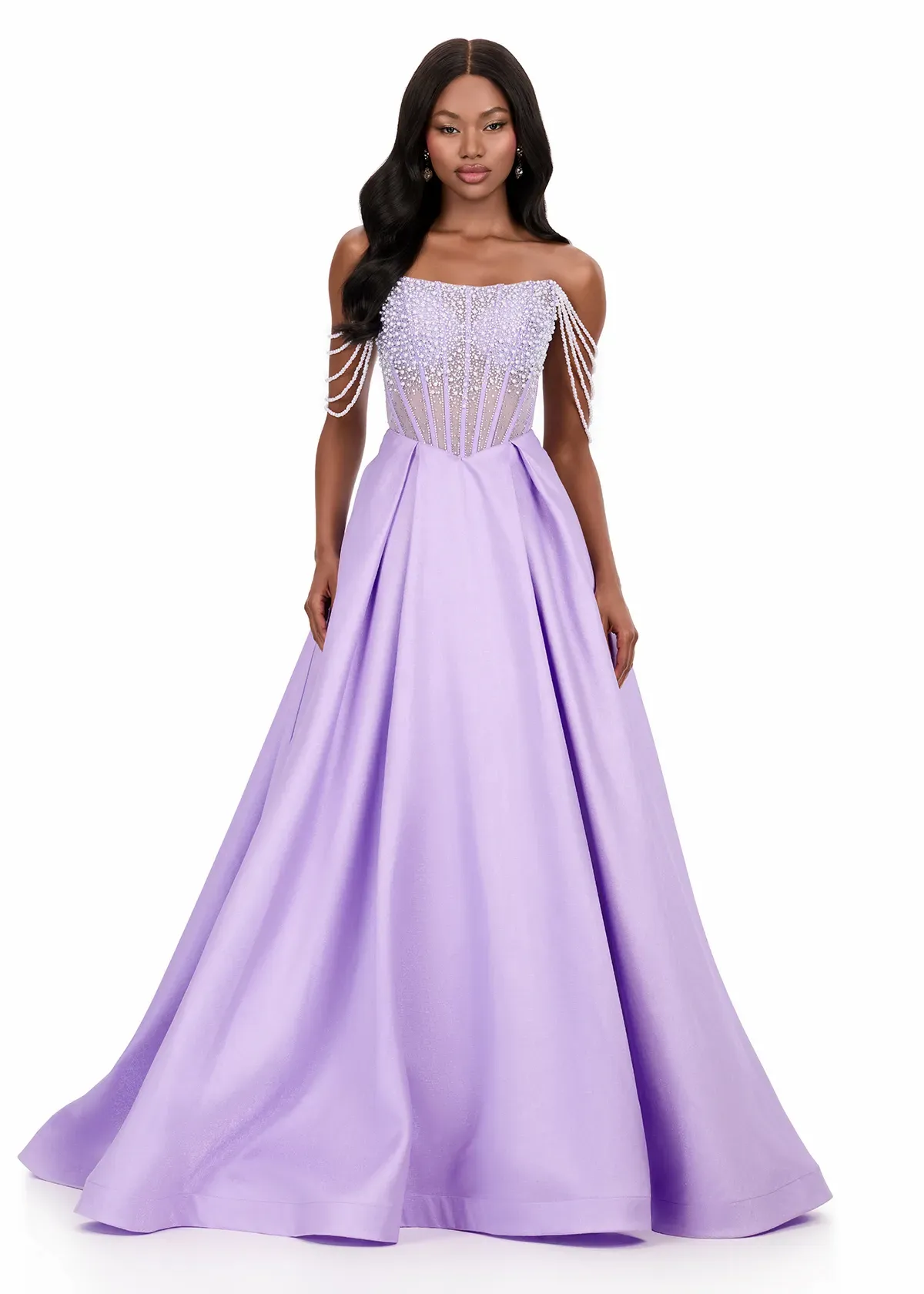 Make a fairytale entrance in this elegant Mikado ball gown with eye-catching sparkle and timeless charm. The strapless bodice of ASHLEYlauren Style 12248 is fully embellished with shimmering beadwork and dramatic draped pearl strands, creating a luxurious, high-impact look. The structured A-line skirt provides volume and movement, giving this gown a regal finish suitable for any formal stage.