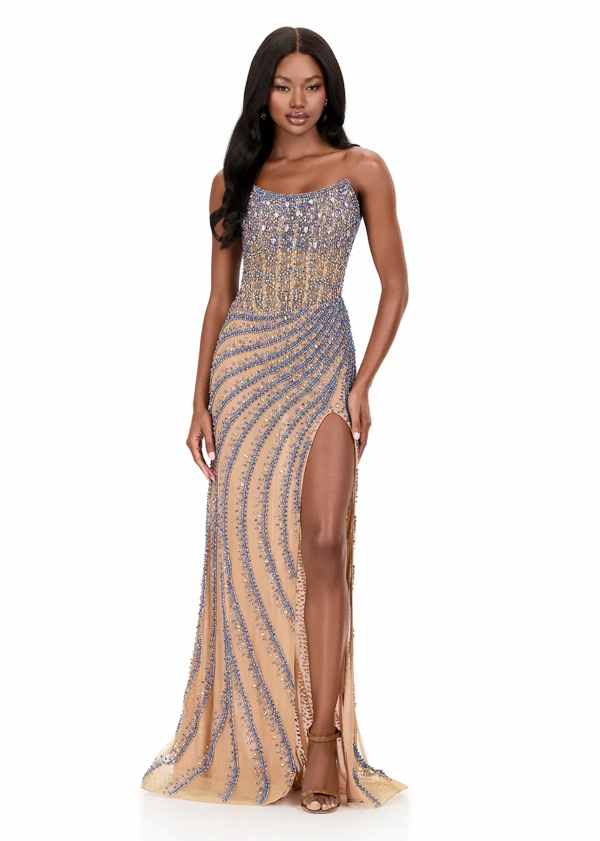 Turn heads in this fully beaded gown crafted with dazzling swirl-pattern beadwork that elongates and shapes the silhouette. The strapless neckline and high slit on ASHLEYlauren Style 12328 create a bold, glamorous look perfect for making an unforgettable entrance. With its luxurious beading and curve-defining structure, this gown is a standout choice for evening events and pageants.