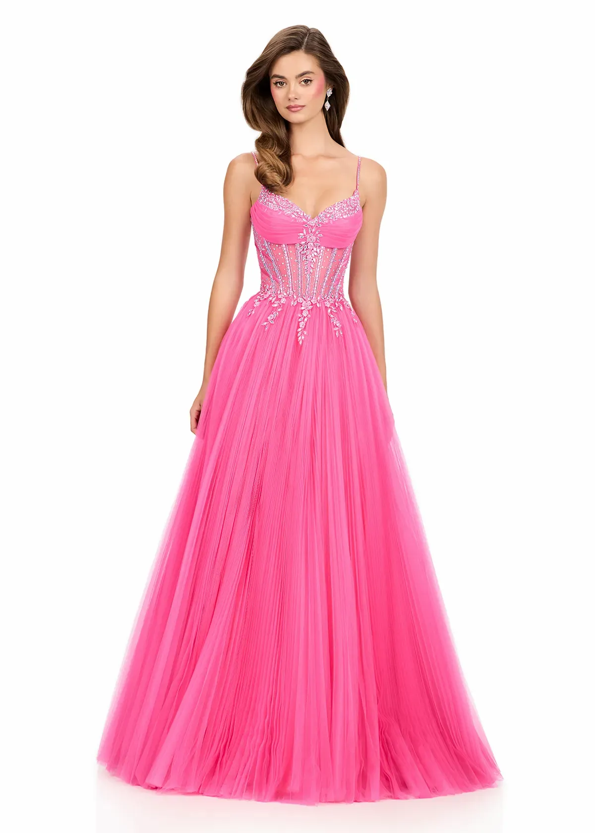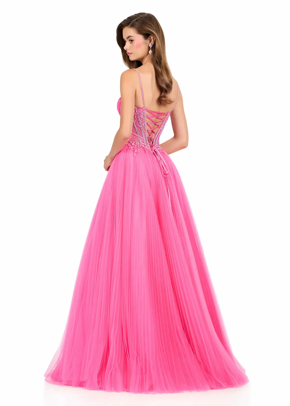Romantic and whimsical, this ASHLEYlauren Style 12246 blends fairytale charm with glamour. The corset-style bodice is adorned with intricate beadwork and structured cups for a flattering fit, while the pleated tulle A-line skirt adds volume and graceful movement. With lace-up back detailing and vibrant color options, this gown is designed to shine on stage or at any formal celebration.